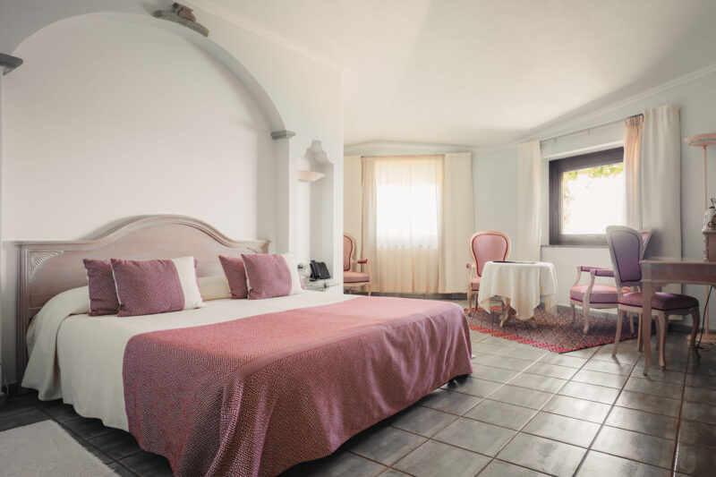The spacious, sunny Junior Suites, facing east, with a sea view are located on first or second floor. The romantically decorated bedroom and living room are all in one room.. The bathroom has both a shower and a Jacuzzi. All are equipped with air conditioner, wifi connection, mini bar, mini safe, hairdryer and TV sat.